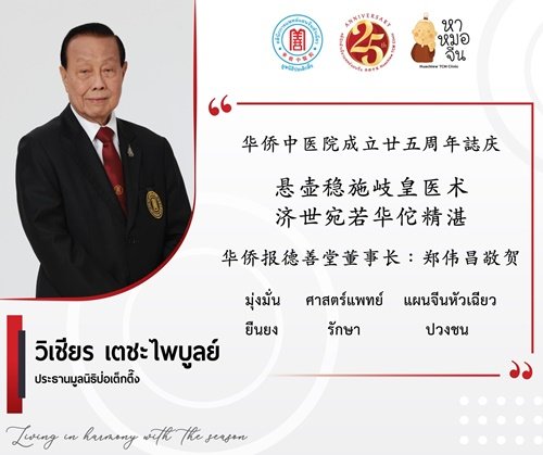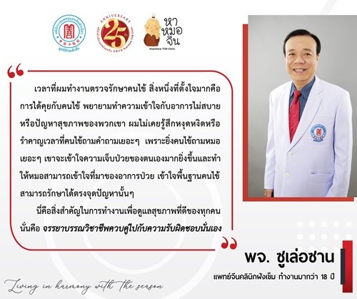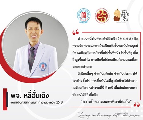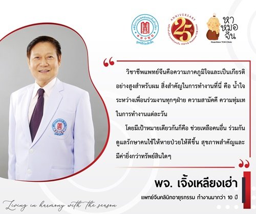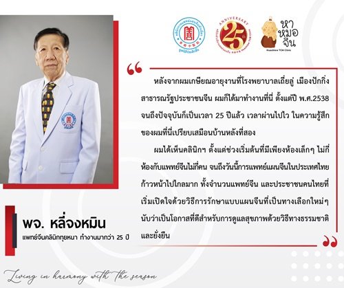 "หลังจากผมเกษียณอายุงานที่โรงพยาบาลเถี่ยลู่ เมืองปักกิ่ง สาธารณรัฐประชาชนจีน ผมก็ได้มาทำงานที่นี่ ตั้งแต่ปี พ.ศ.2538 จนถึงปัจจุบันก็เป็นเวลา 25 ปีแล้ว เวลาผ่านไปไว ในความรู้สึกของผมที่นี่เปรียบเสมือนบ้านหลังที่สอง ผมได้เห็นคลินิกฯ ตั้งแต่ช่วงเริ่มต้นที่มีเพียงห้องเล็กๆ ไม่กี่ห้องกับแพทย์จีนไม่กี่คน จนถึงวันนี้ การแพทย์แผนจีนในประเทศไทยก้าวหน้าไปไกลมาก ทั้งจำนวนแพทย์จีน และประชาชนคนไทยที่เริ่มเปิดใจด้วยวิธีการรักษาแบบแผนจีนที่เป็นทางเลือกใหม่ๆ นับว่าเป็นโอกาสที่ดีสำหรับการดูแลสุขภาพด้วยวิธีทางธรรมชาติและยั่งยืน"