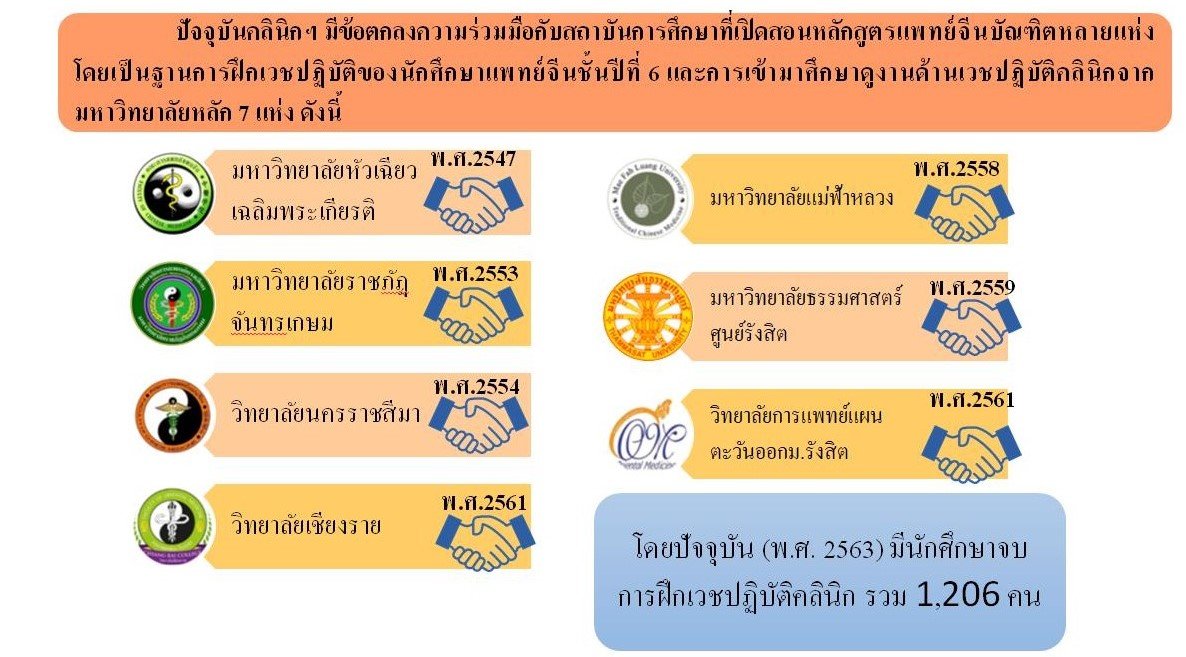 • เสริมสร้างองค์ความรู้ด้านการแพทย์แผนจีน ได้มีการเรียนรู้การตรวจวินิจฉัยและการอบรมด้านการแพทย์แผนจีนจากผู้เชี่ยวชาญโดยตรง จากโรงพยาบาลหลงหัวสังกัดมหาวิทยาลัยการแพทย์แผนจีนเซี่ยงไฮ้
