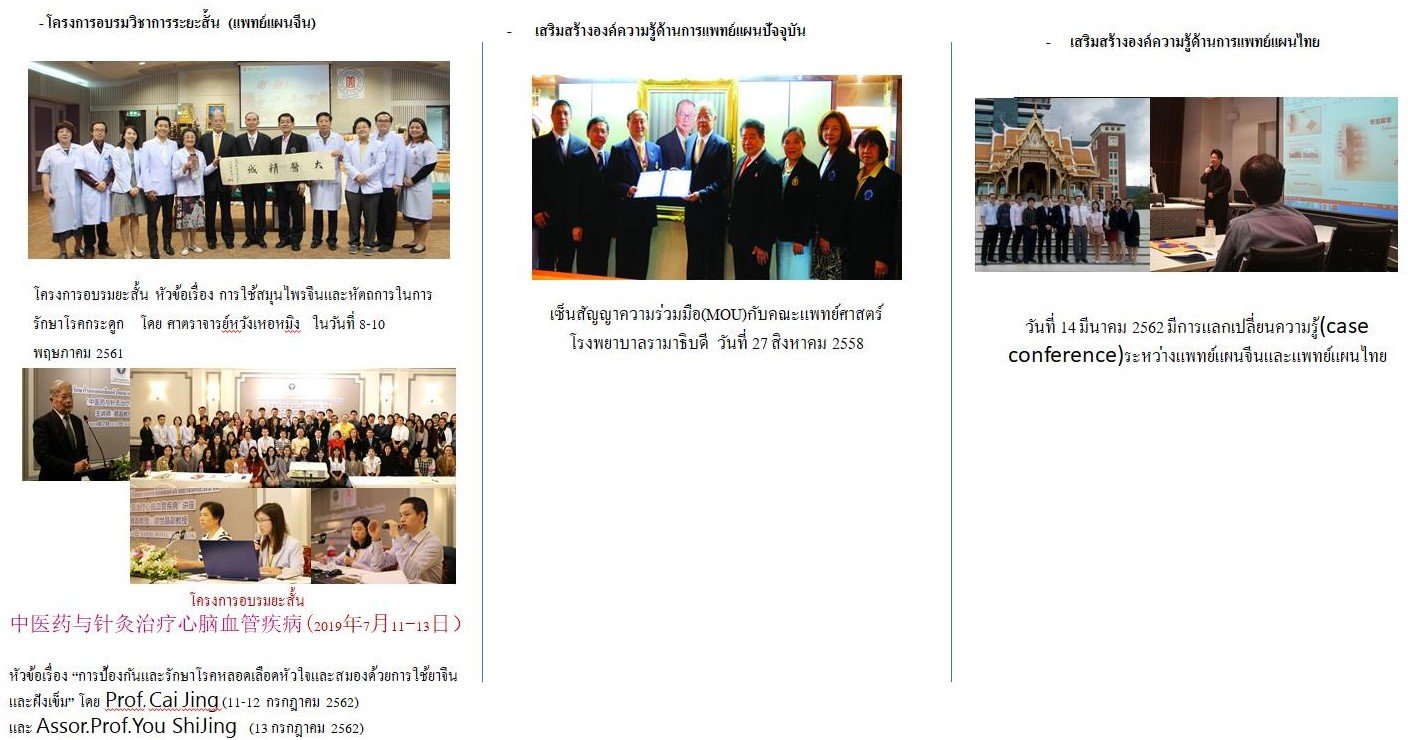 • การอบรมทางวิชาการระยะสั้น โดยผู้เชี่ยวชาญจาก โรงพยาบาลหลงหัวสังกัดมหาวิทยาลัยการแพทย์แผนจีนเซี่ยงไฮ้, มหาวิทยาลัยการแพทย์แผนจีนเทียนจิน,