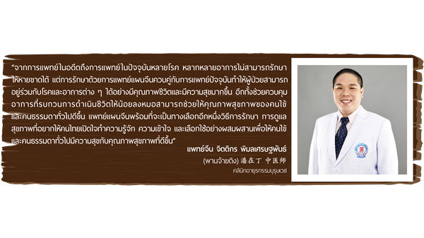 “จากการแพทย์ในอดีตถึงการแพทย์ในปัจจุบันหลายโรค หลากหลายอาการไม่สามารถรักษาให้หายขาดได้ แต่การรักษาด้วยการแพทย์แผนจีนควบคู่กับการแพทย์ปัจจุบัน ทำให้ผู้ป่วยสามารถอยู่ร่วมกับโรคและอาการต่างๆได้อย่างมีคุณภาพชีวิตและมีความสุขมากขึ้น อีกทั้งช่วยควบคุมอาการที่รบกวนการดำเนินชีวิตให้น้อยลง
