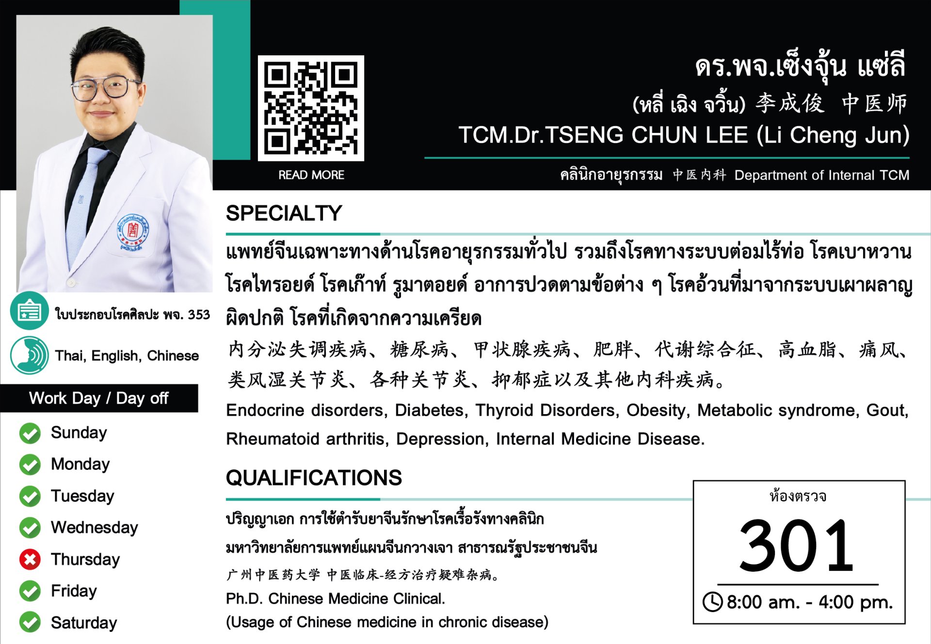 วันที่ออกตรวจ | วันจันทร์ วันอังคาร วันพุธ วันศุกร์ วันเสาร์ วันอาทิตย์ |