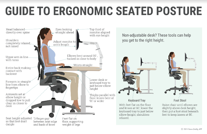 2. ในระหว่างเล่นกีฬาควรจัดท่านั่งตามหลักการยศาสตร์ (Ergonomics) คือ การจัดหรือปรับสภาพแวดล้อมของสิ่งแวดล้อมต่าง ๆ ของเครื่องมือการทำงานให้เข้ากับผู้ปฏิบัติงานได้ รวมไปถึงการปรับสรีระของร่างกายเพื่อให้การทำงานสะดวกสบายขึ้น