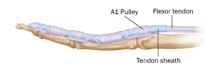 เส้นเอ็นของนิ้ว (Tendon) ทำหน้าที่งอ ข้อนิ้วประกอบด้วยเส้นเอ็น 2 เส้น คือเส้นเอ็นของ flexor digitorum superficailis (FDS) และ flexor digitorum profundus (FDP) โดยเส้นเอ็นทั้งสอง จะวางตัวอยู่ด้วยกัน วิ่งลอดเข้าไปในปลอกหุ้มเอ็น (Pulley) เกาะที่ข้อนิ้วข้อกลางและข้อปลายตามลำดับ ทำให้สามารถงอนิ้วได้ ปลอกหุ้มเอ็น (Pulley) ทำหน้าที่ยึดเส้นเอ็น (Tendon) ให้ติดกับกระดูกคล้ายรอกคือช่วยลดระยะทางจากจุดหมุนของข้อต่อถึง จุดกึ่งกลางของเส้นเอ็นให้น้อยลง ทำให้ข้อสามารถเคลื่อนที่ได้มากขึ้น โดยจะมีระบบ pulley 2 ระบบ ได้แก่ Annular Pulley (A pulley) และ Cruciate Pulley (C pulley) โดย A pulley จะมีความหนา และแข็งแรงกว่า C pulley สามารถยึดเส้นเอ็นให้ติด กับกระดูกได้ดีกว่า ประกอบด้วย 5 pulley คือ A1- A5 pulley ส่วนปลอกหุ้มเอ็น cruciate ประกอบไป ด้วย 3 pulley คือ C1-C3 pulley ระหว่างปลอกหุ้ม เอ็นและเส้นเอ็นนั้นจะมีของเหลวเป็นสารหล่อลื่นอยู่ ภายใน (synovial membrane) เพื่อลดแรงเสียดทาน ในขณะที่เส้นเอ็นมีการเคลื่อนตัว
