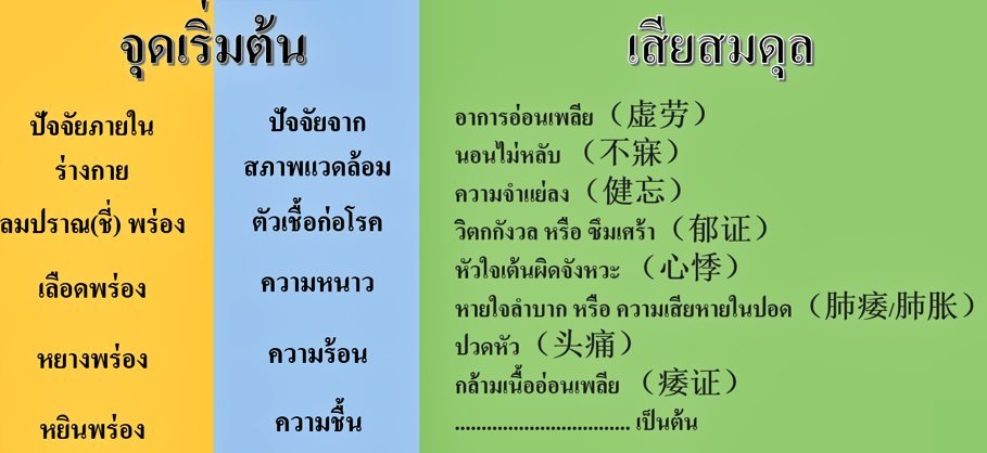 ตามศาสตร์การแพทย์แผนจีน ซึ่งไม่ใช่การรักษาทางหลักในประเทศไทย แต่จะเน้นไปที่การรักษาเพื่อส่งเสริมสุขภาพ โดยใช้วิธีการตรวจวินิจฉัยโรคแบบองค์รวม และการวินิจฉัยแยกแยะกลุ่มอาการ การเกิดโรคเริ่มจากปัจจัยภายในร่างกายที่มีภาวะไม่สมดุล ได้แก่ ชี่พร่อง , ชี่ติดขัด , เลือดพร่อง , เลือดคั่ง หยางพร่อง , อินพร่อง , เสมหะชื้น , ร้อนชื้น เมื่อร่วมกับปัจจัยสภาพแวดล้อม ได้แก่เชื้อก่อโรค ความหนาว ความร้อน ความชื้น ทำให้ร่างกายเสียสมดุล เกิดเป็นโรคขึ้น