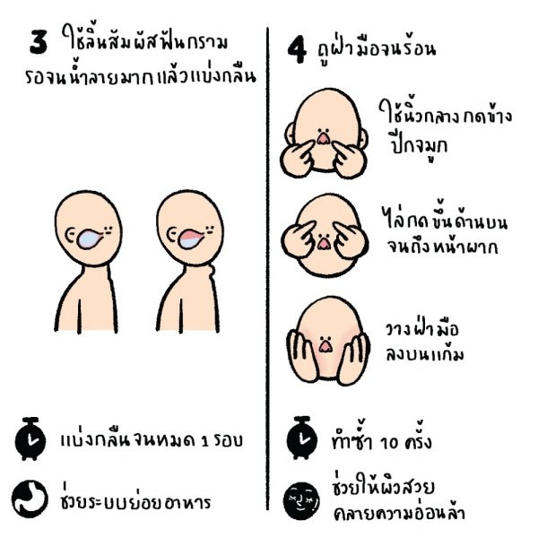 3. ค่อยๆกลืนน้ำลาย โดยใช้ลิ้นสัมผัสฟันกรามเพื่อให้มีน้ำลายออกมา รอจนน้ำลายมีปริมาณมากขึ้น จากนั้นค่อยๆแบ่งกลืนทีละนิด ช่วยให้ระบบย่อยอาหารทำงานดีขึ้น