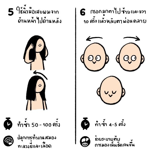 5. หวีผมด้วยนิ้วมือ ใช้นิ้วมือทั้งสิบนิ้วเสยผมออกช้าๆ เริ่มจากด้านหน้าศรีษะไปยังด้านหลัง ทำซ้ำ 50-100 ครั้ง ช่วยทะลวงชี่และเลือด เป็นการปลุกการทำงานของสมอง