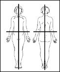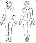 - อาการปวดกระจายทั่วไปตามร่างกาย โดยตำแหน่งที่ปวดต้องมีทั้งซีกขวาและซ้าย ตำแหน่งที่ปวดต้องมีทั้งเหนือและใต้เอว และต้องมีตำแหน่งที่ปวดอยู่แนวกลางลำตัวด้านหลังหรือหน้า (ตามรูป)