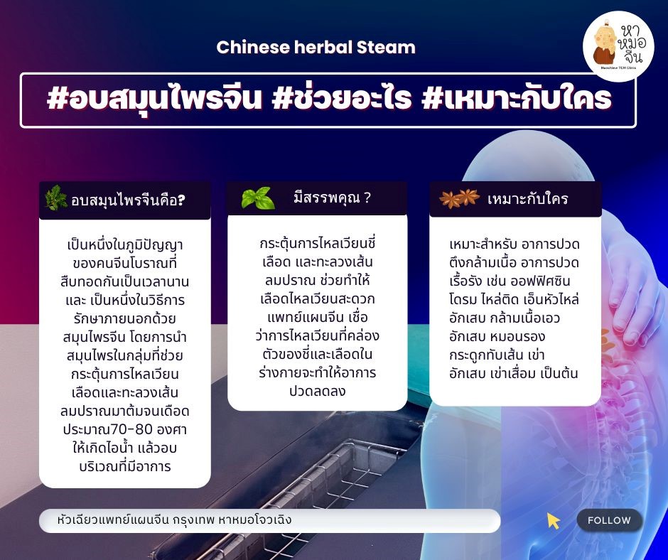 การอบไอน้ำสมุนไพรจีน (熏药)คลายปวด ลดตึง เป็นหนึ่งในภูมิปัญญาของคนจีนโบราณที่สืบทอดกันเป็นเวลานาน และ เป็นหนึ่งในวิธีการรักษาภายนอกด้วยสมุนไพรจีน เทียบเคียงได้กับการประคบร้อนในทางแพทย์แผนปัจจุบัน นิยมใช้กับผู้ป่วยที่มีอาการปวดตึงกล้ามเนื้อ อาการปวดเรื้อรัง เช่น ออฟฟิศซินโดรม ไหล่ติด เอ็นหัวไหล่อักเสบ กล้ามเนื้อเอวอักเสบ หมอนรองกระดูกทับเส้น เข่าอักเสบ เข่าเสื่อม เป็นต้น