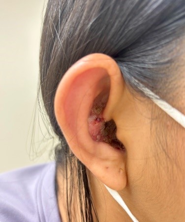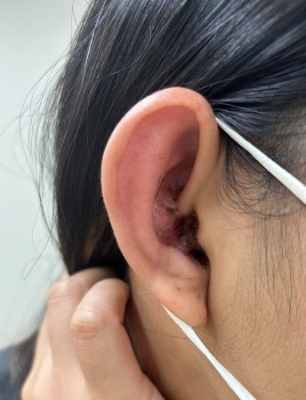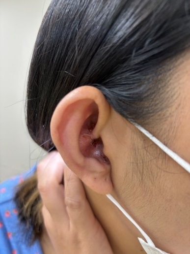 - มีผื่นลักษณะตุ่มน้ำใส ผื่นแดงแสบร้อน บริเวณ กกหู ช่องหูชั้นนอก หรือบริเวณข้างเคียงใบหู
