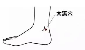 จุดไท่ซี 太溪(KI3)อยู่ด้านในข้อเท้า ในร่องระหว่างขอบหลังตาตุ่มในกับเอ็นร้อยหวาย