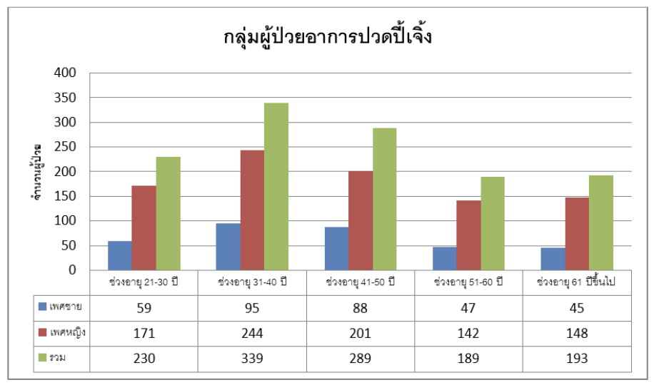 โดยช่วงอายุที่มีกลุ่มอาการปวดมากสุด 3 อันดับแรก คือ กลุ่มผู้ป่วยอายุ 31-40 ปี รองลงมาคือ กลุ่มผู้ป่วยอายุ 41-50ปี และกลุ่มผู้ป่วยอายุ 21-30ปีตามลำดับ จะเห็นได้ว่าจากเดิมกลุ่มอาการปวดออฟฟิศซินโดรม มักเกิดขึ้นในวัยคนทำงานที่อยู่ในช่วงอายุ 30-40 ปี แต่ปัจจุบันไม่ใด้จำกัดแค่พนักงานออฟฟิตหรือกลุ่มวัยทำงานทั่วไปที่ทำงานหน้าคอมพิวเตอร์ โดยเฉพาะช่วง 3-4 ปีที่ผ่านมา เนื่องจากผลกระทบจาก COVID-19 ทำให้เกิดการปรับเปลี่ยนพฤติกรรมการเรียนหรือการทำงานจาก onsite เป็น online แทน ต้องใช้คอมพิวเตอร์ในการศึกษาตั้งแต่อายุยังน้อย ทำให้กลุ่มช่วงวัยเรียนหรือวัยรุ่น ช่วง อายุ 10-20 ปี ประสบปัญหาเรื่องอาการปวดได้ด้วยเช่นเดียวกัน รวมถึงกลุ่มผู้สูงอายุ ช่วง 61ปีขึ้นไป ที่ปัจจุบันหันมาใช้เทคโนโลยีมากขึ้น ทั้งโทรศัพท์มือถือ แท็บเล็ตต่างๆทำให้ขอบเขตกลุ่มอายุของโรคออฟฟิศซินโดรมจึงไม่ได้จำกัดแค่วัยทำงานอีกต่อไป