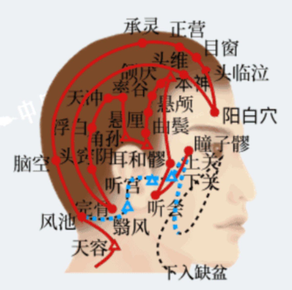 รูปที่ 1 เส้นประสีฟ้า แสดงถึงทิศทางการเดินของเส้นลมปราณถุงน้ำดีของหู