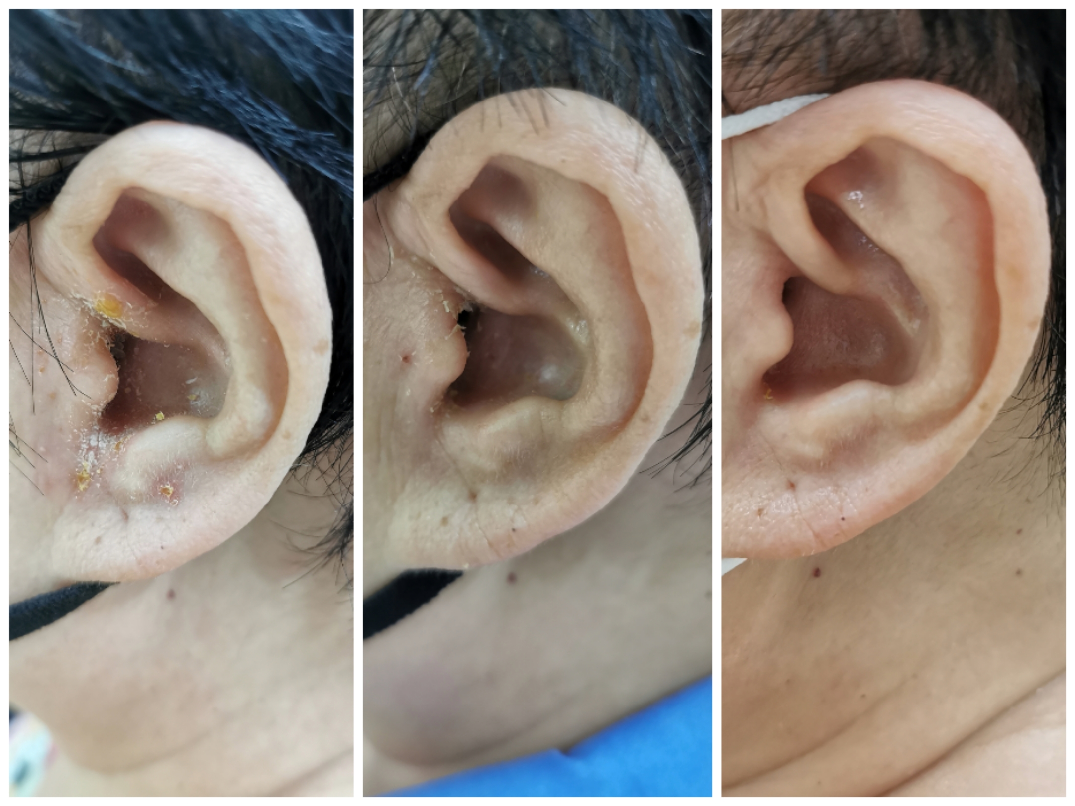 รูปที่ 2 ผื่นบริเวณหู ตลอดระยะเวลาการรักษา 1 เดือน