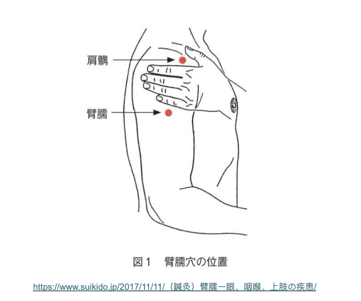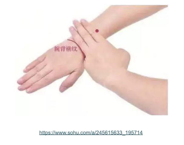 ตำแหน่ง : เมื่องอข้อศอก จุดจะอยู่ต่ำกว่ามุมข้อพับประมาณ 3-4 ข้อมือ ใช้นิ้วชี้ นิ้วกลาง นิ้วนางอีกข้างวางทาบ จุดกดอยู่ตรงบริเวณขอบนิ้วนาง