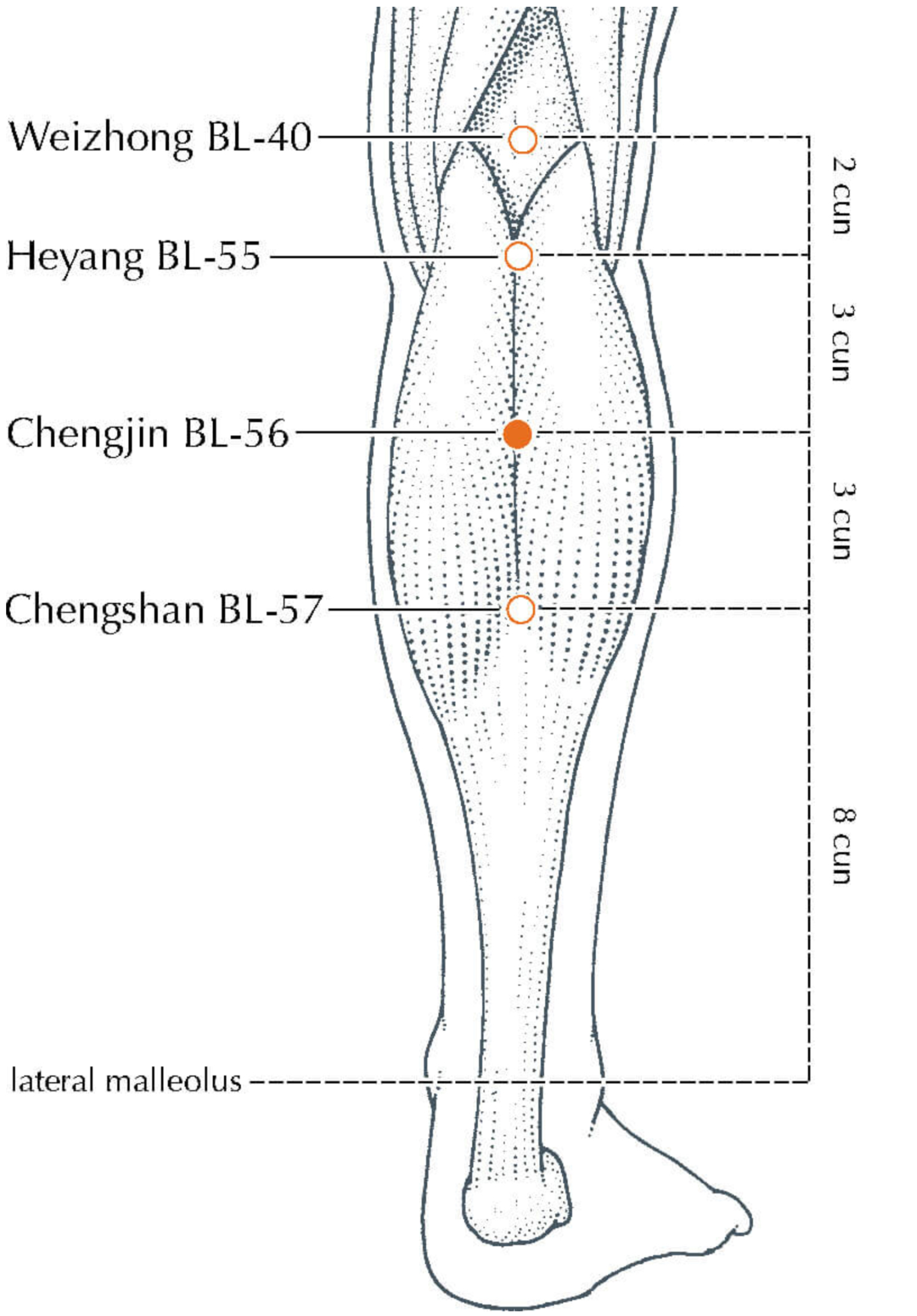 - จุดเฉิงจิน (承筋, BL56) : สังกัดเส้นลมปราณกระเพาะปัสสาวะ