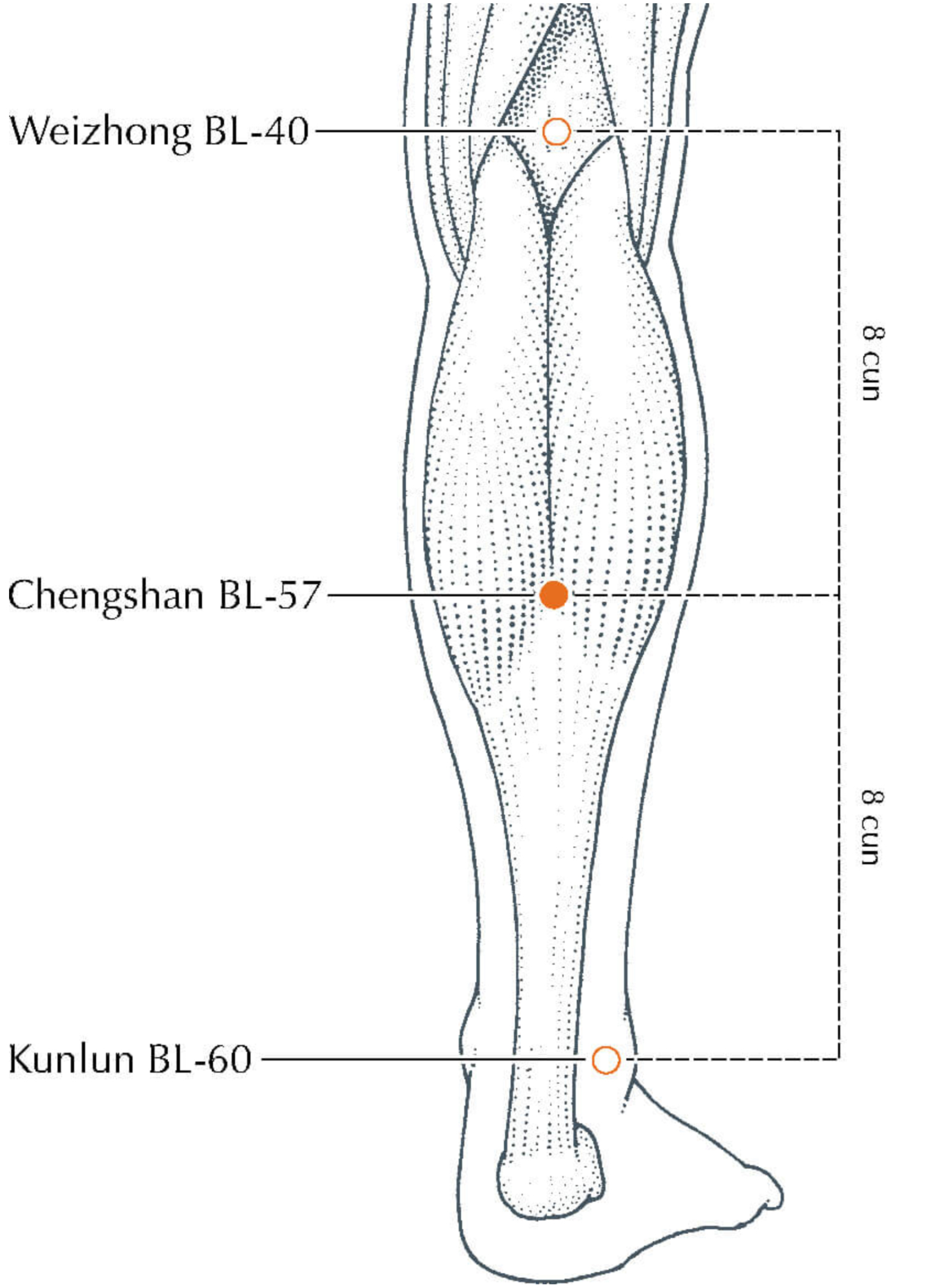 - จุดเฉิงซาน (承山, BL57) : สังกัดเส้นลมปราณกระเพาะปัสสาวะ