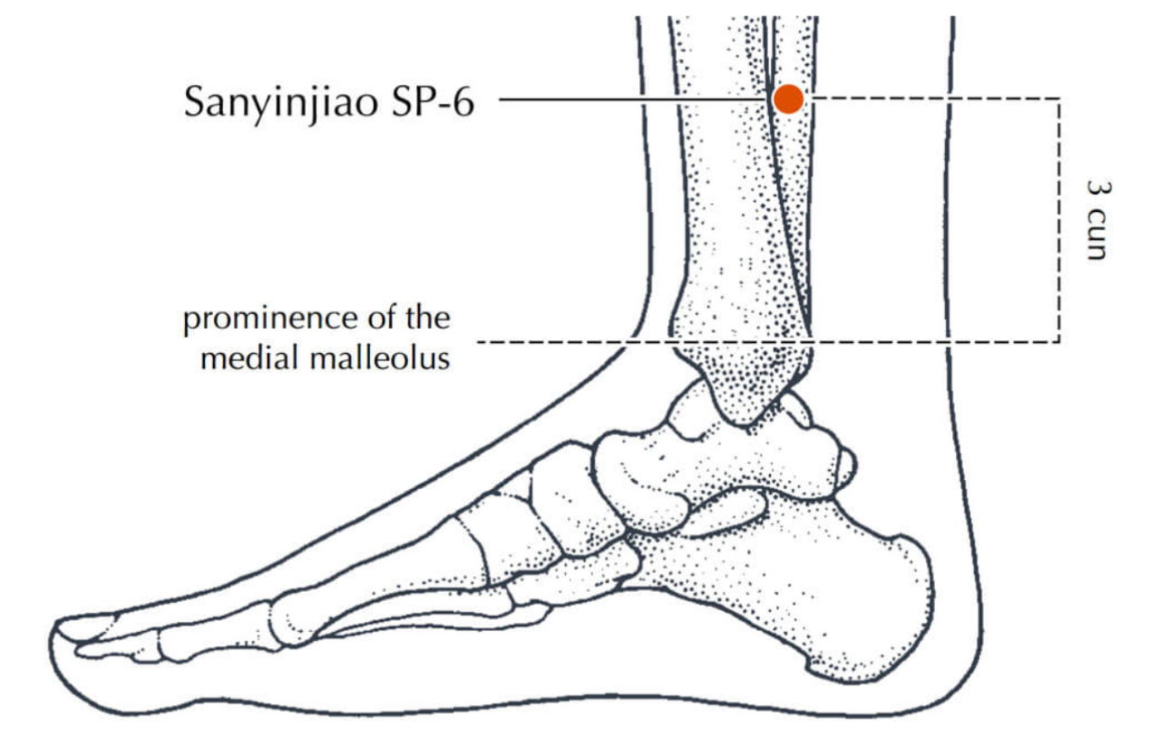 - จุดซานอินเจียว (三阴交, SP6) : สังกัดเส้นลมปราณม้าม