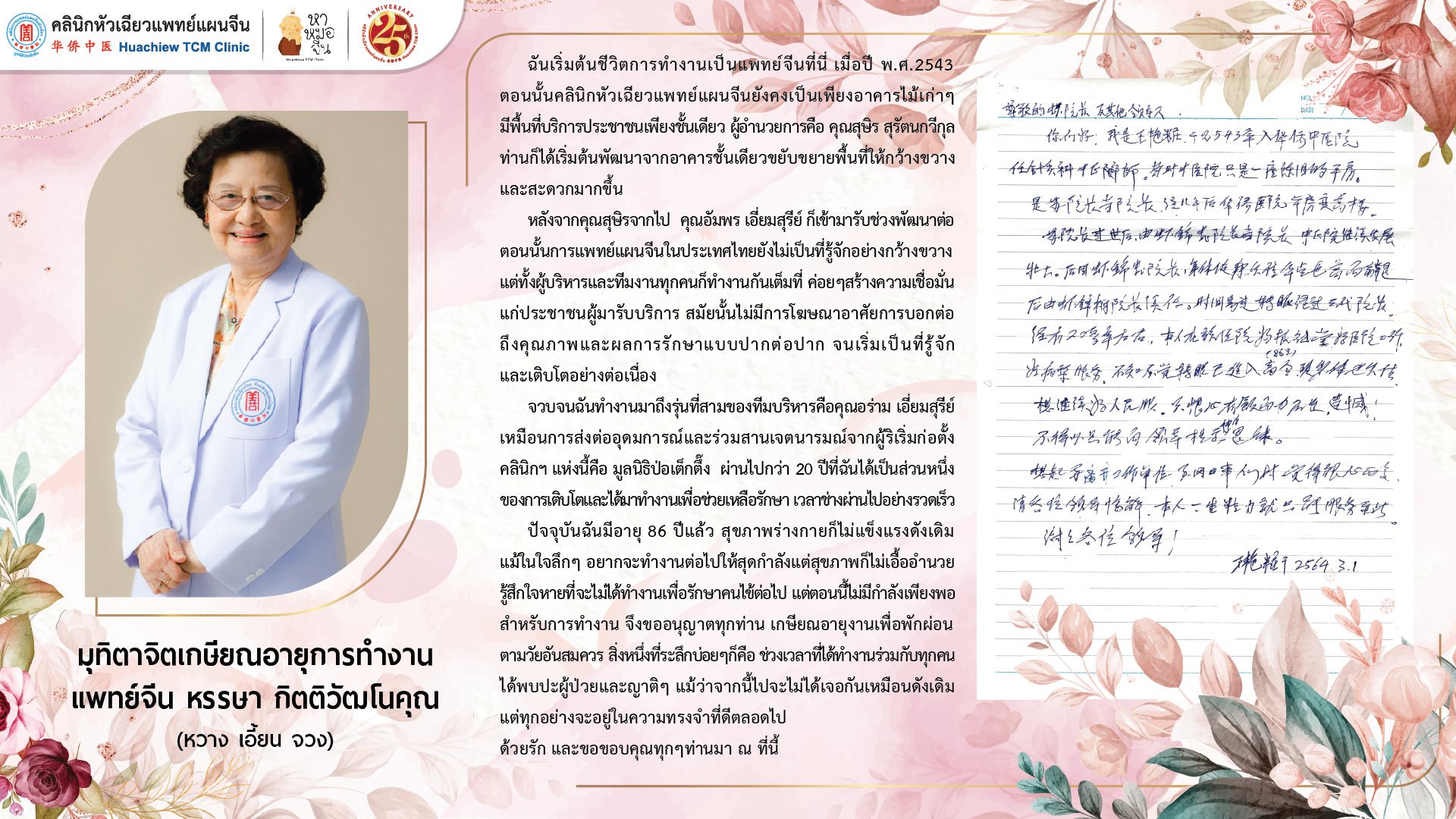 จวบจนฉันทำงานมาถึงรุ่นที่สามของทีมบริหารคือคุณอร่าม เอี่ยมสุรีย์ เหมือนการส่งต่ออุดมการณ์และร่วมสานเจตนารมณ์จากผู้ริเริ่มก่อตั้งคลินิกฯแห่งนี้คือ มูลนิธิป่อเต็กตึ๊ง ผ่านไปกว่า 20กว่าปีที่ฉันได้เป็นส่วนหนึ่งของการเติบโตและได้มาทำงานเพื่อช่วยเหลือรักษา เวลาช่างผ่านไปอย่างรวดเร็ว ปัจจุบันฉันมีอายุ 86 ปีแล้ว สุขภาพร่างกายก็ไม่แข็งแรงดังเดิม แม้ในใจลึกๆ อยากจะทำงานต่อไปให้สุดกำลังแต่สุขภาพก็ไม่เอื้ออำนวย รู้สึกใจหายที่จะไม่ได้ทำงานเพื่อรักษาคนไข้ต่อไป แต่ตอนนี้ไม่มีกำลังเพียงพอสำหรับการทำงาน จึงขออนุญาตทุกท่าน เกษียณอายุงานเพื่อพักผ่อนตามวัยอันสมควร