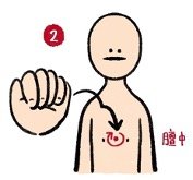 2) กำปั้นคลึงกลางหน้าอก(拳揉膻中): ให้ผู้ป่วยกำมือข้างขวา จากนั้นให้กำปั้นมือขวาฝั่งนิ้วโป้งถึงนิ้วก้อยแนบไปบริเวณจุดถันจง(CV17 膻中)คลึงจนรู้สึกหน่วงๆประมาน 2 นาที