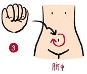3) คลึงท้อง(揉腹): ใช้กำปั้นมือขวาคลึงบริเวณสะดือและรอบๆสะดือ 8-12 ครั้ง