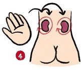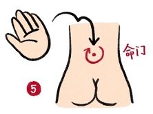 4) นวดบริเวณตำแหน่งของไต(按摩肾区): ไตอยู่บริเวณด้านหลังข้างแนวกระดูกสันหลังทั้งสองข้าง ระดับเดียวกับสะดือ สามารถใช้ฝ่ามือทั้งสองคลึงประมาน 8-12 ครั้ง