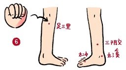 6) กดคลึงจุดไท่ซี ไท่ชง ซานอินเจียวและเคาะจุดจู๋ซานหลี่(按揉太溪,太冲,三阴交,叩击足三里): ผู้ป่วยอยู่ในท่านั่งชันเข่าทั้งสองข้าง จากนั้นใช้นิ้วชี้และนิ้วกลางกดคลึงจุดไท่ซี(KI3 太溪),จุดไท่ชง(LR3 太冲)และจุดซานอินเจียว(SP6 三阴交)จนรู้สึกหน่วงๆประมาน 1 นาที จากนั้นกำมือทั้งสองข้างเป็นกำปั้นแล้วใช้สันมือฝั่งนิ้วก้อยเคาะบริเวณจุดจู๋ซานหลี่(ST36 足三里)จนรู้สึกหน่วงๆประมาน 1 นาที