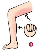8) เคาะต้นขาและน่องด้านใน(叩击大腿及小腿内侧): ผู้ป่วยอยู่ในท่านั่งงอเข่าหรือขัดสมาธิ จากนั้นใช้กำปั้นเคาะไปบริเวณต้นขาและน่องด้านในไปกลับ จนรู้สึกอุ่นๆเล็กน้อยประมาน 8-12 ครั้ง