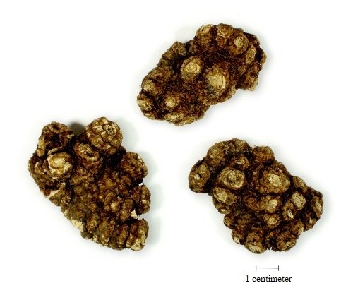 Irregular knotty and fist-like. External yellowish-brown, rough and wrinkled, with many parallel and raised annulations. Texture compact, uneasily broken. Odor, strongly aromatic; taste bitter, pungent and slightly sweet, and tongue numbing afterward.