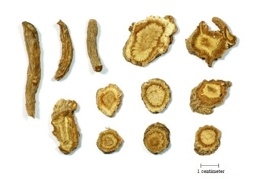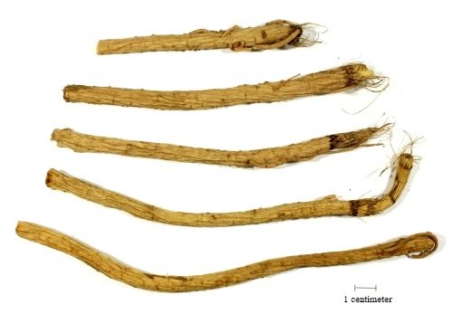 Long conical or long cylindrical, slightly tortuous. External greyish-brown, rugged, with longitudinal wrinkles, numerous transverse elongated lenticel-like protrudings and dotted raised rootlet scars. Root stock with obvious dense annulations, some annulations marked by brown hair-like remains of leaf bases. Texture light, easily broken, fracture uneven, bark brownish-yellow and cracked, Wood yellow. Odor, characteristic; taste, slightly sweet.