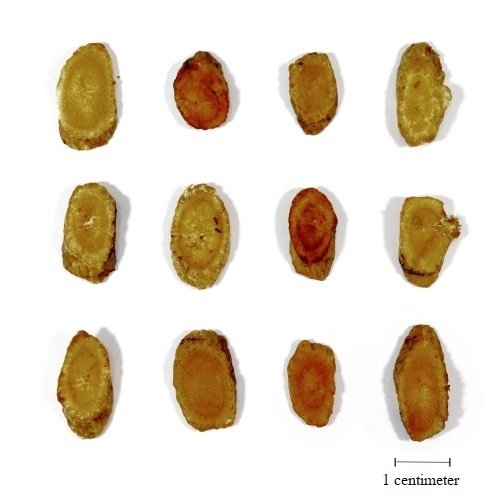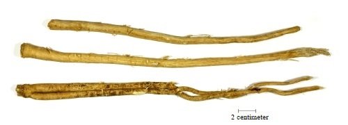 Cylindrical, some branched, upper part relatively broad. External pale brownish-yellow or pale brown, with irregular, longitudinal wrinkles or furrows. Texture hard and tenacious, uneasily broken, fracture highly fibrous and starchy, wood pale yellow, with radiate striations and fissures, the center part of old root occasionally rotten-wood-shaped, blackish-brown or hollowed. Odor, slight; taste, slightly sweet, and slightly bean-like on chewing.