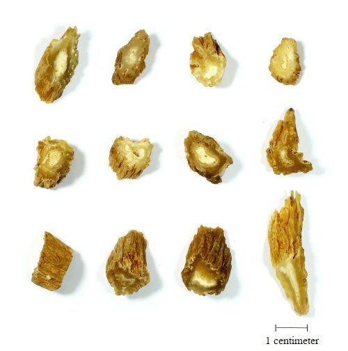 Duiyebaibu (S. tuberosa): Long fusiform or long strip-shaped, external yellowish-brown to greyish-brown, with shallow longitudinal furrows. Texture compact, fracture yellowish-white or dark brown, stele large and whitish.