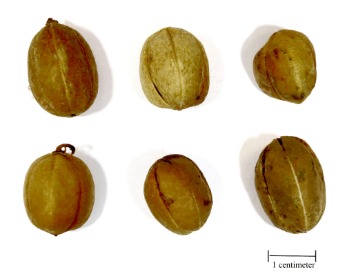 Ovoid, usually 3-ribbed. External greyish-yellow, rough, with 6 longitudinal lines, apex truncate, base with a fruit stalk scar, on opening shell, 3 loculi in the shell each containing 1 seed. Seed slightly flattened-elliptical, external brown or greyish-brown, kernels yellowish-white, oily. Odor, slight; taste, pungent.