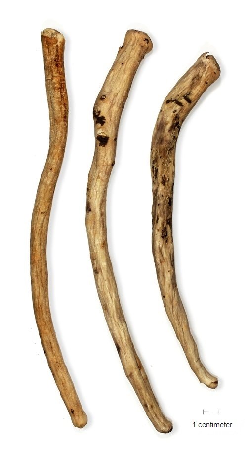 Cylindrical, straight or slightly curved, both ends truncated. External white or pale brownish-red, glossy and smooth or with longitudinal wrinkles and fibrous roots scars. Texture hard, not easily broken. Odor, slight; taste, slightly bitter and sour.