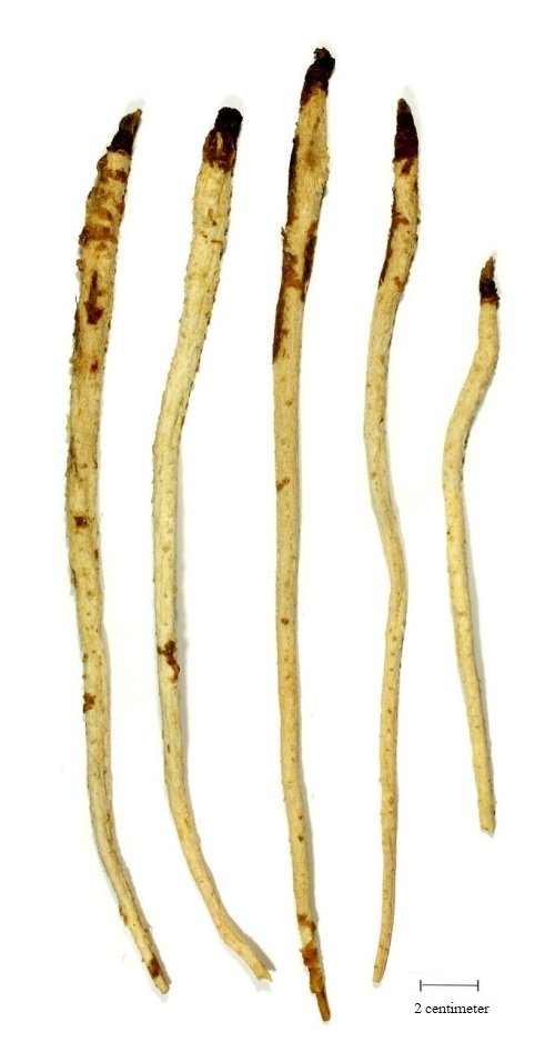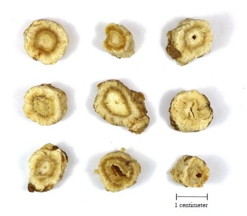 Slenderly cylindrical, branching occasionally. External yellowish-white, slightly rough, occasionally with patches of cork adhering, finely wrinkled longitudinally, and with brownish-yellow spotted rootlet scars. Top usually with yellowish-brown remains of rhizome. Texture fragile, easily broken, fracture yellowish-white in bark and yellow in wood. Odor, characteristic; taste, slightly sweet.