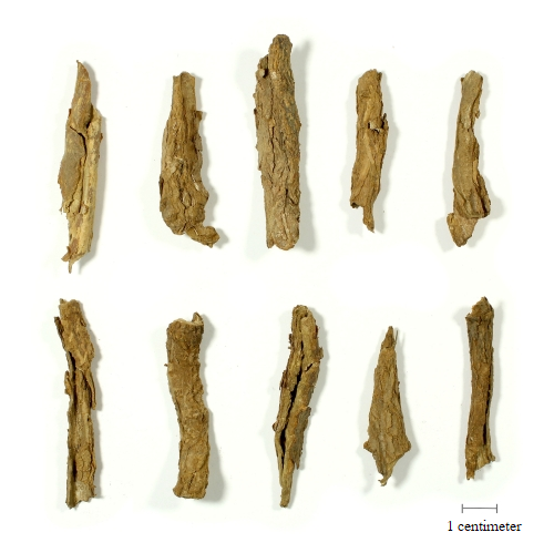yellow, rough, with irregular longitudinal fissures, easily exfoliated. Inner surface yellowish-white to greyish-yellow, relatively even, with fine longitudinal striations. Texture light and fragile, easily broken, fracture uneven, outer layers yellowish-brown and inner layers greyish-white. Odor, slight; taste, sweetish and then bitter.