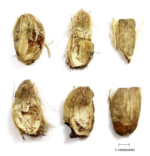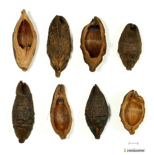 Elliptical or long-ovate gourd-shaped. Epicarp deep brown to blackish, with irregular longitudinal wrinkles and raised transverse lines on the surface; style scars at apex and fruit stalk and remains of calyx at the base. Endocarp dented, brown or deep brown, smooth and hard shell-shaped. Mesocarp fibers visible when broken longitudinally. Texture light and hard. Odor, slight; taste, slightly astringent.
