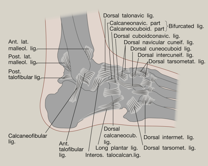 1. กลุ่มเส้นเอ็นข้อเท้าด้านนอก (Lateral ligament complex) ซึ่งมีหน้าที่สร้างความมั่นคงต่อการเกิดพลิกข้อเท้าเข้าด้านใน (Inversion) และเลื่อนมาทางด้านหน้า (Anterior translation) ประกอบด้วย Anterior talofibular ligament (ATFL) Calcaneofibular ligament (CFL) และ Posterior talofibular ligament (PTFL)