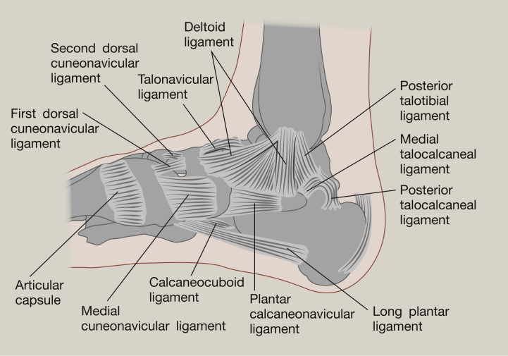2. กลุ่มเส้นเอ็นข้อเท้าด้านใน (Medial ligament complex) ซึ่งมีหน้าที่สร้างความมั่นคงต่อการเกิดพลิกข้อเท้าออกด้านนอก (Eversion) และหมุนข้อเท้าออกด้านนอก (External rotation) ได้แก่ Superficial deltoid ligament และ Deep deltoid (tibiotalar) ligament