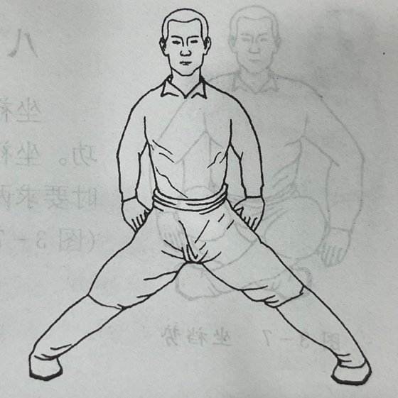 4. ใช้มือทั้งสองเท้าเอว นิ้วหัวแม่มือทั้งสองข้างกดที่จุดเซิ่นซู (BL32 肾俞) หนีบข้อศอก เก็บหน้าท้อง ยืดหน้าอกและเก็บสะโพกยืดลำตัวส่วนบนให้ตรง และโน้มตัวไปข้างหน้าเล็กน้อย