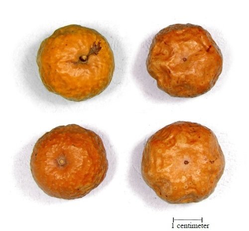 Subspherical or oval. External golden to brownish-yellow, and dispersed small brown spots. Apex with remains of style attached, base dented with a fruit stalk scar. Epicarp leathery, usually separate from mesocarp. Odor, characteristic; taste, sour and bitter.