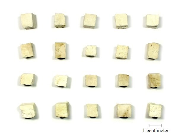 Fulingkuai (peeled and cubic Poria): Cubic pieces or cubic thick slices, varying in thickness. White, pale red or pale brown.