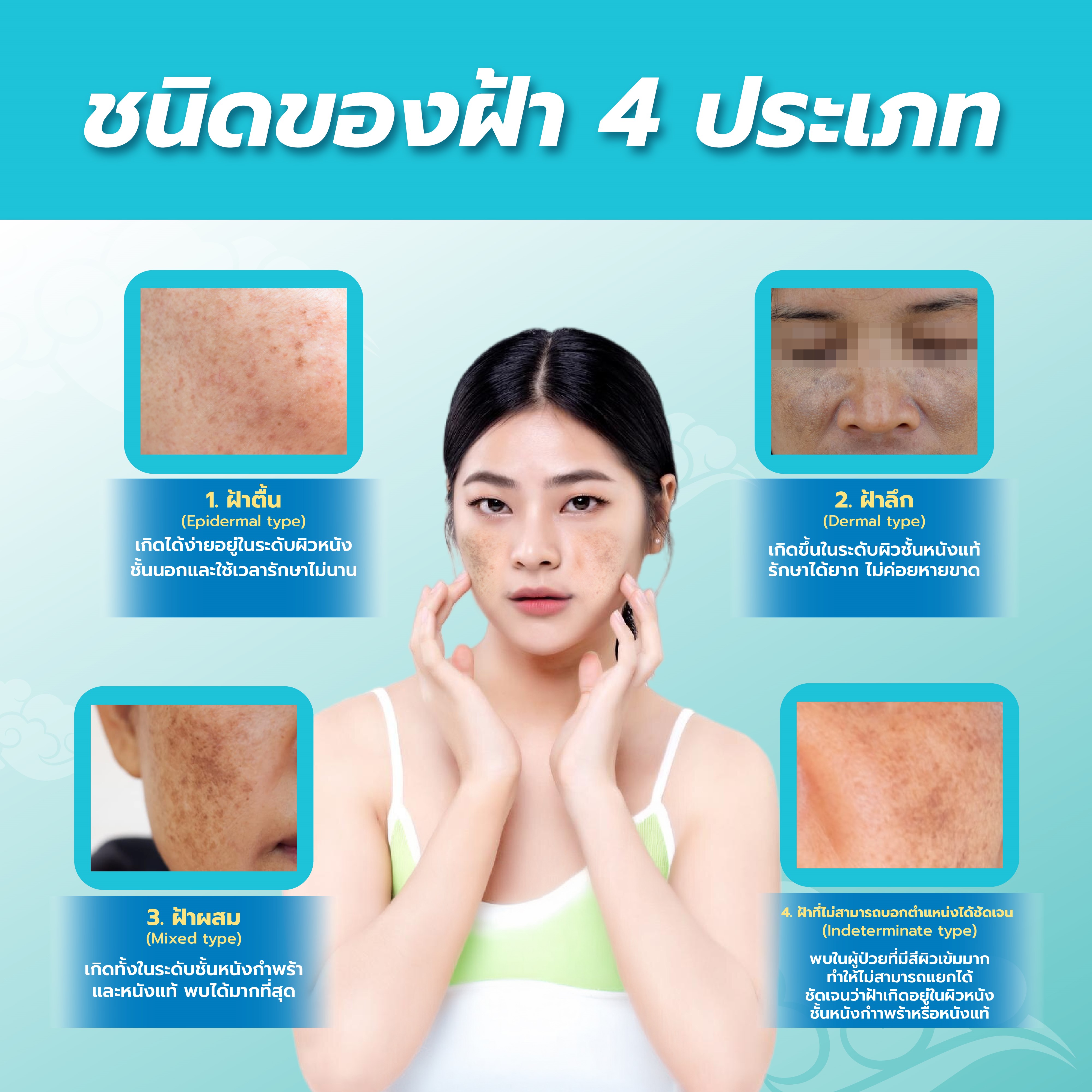 ฝ้าพบบ่อยในผู้หญิงวัยกลางคน ลักษณะเป็นปื้นสีน้ำตาล พบบริเวณแก้ม จมูก หน้าผาก เหนือริมฝีปากบนและคาง มักเริ่มจากจุดสีน้ำตาลแล้วขยายเป็นปื้น เราสามารถแบ่งชนิดของฝ้าได้เป็น 4 ชนิด