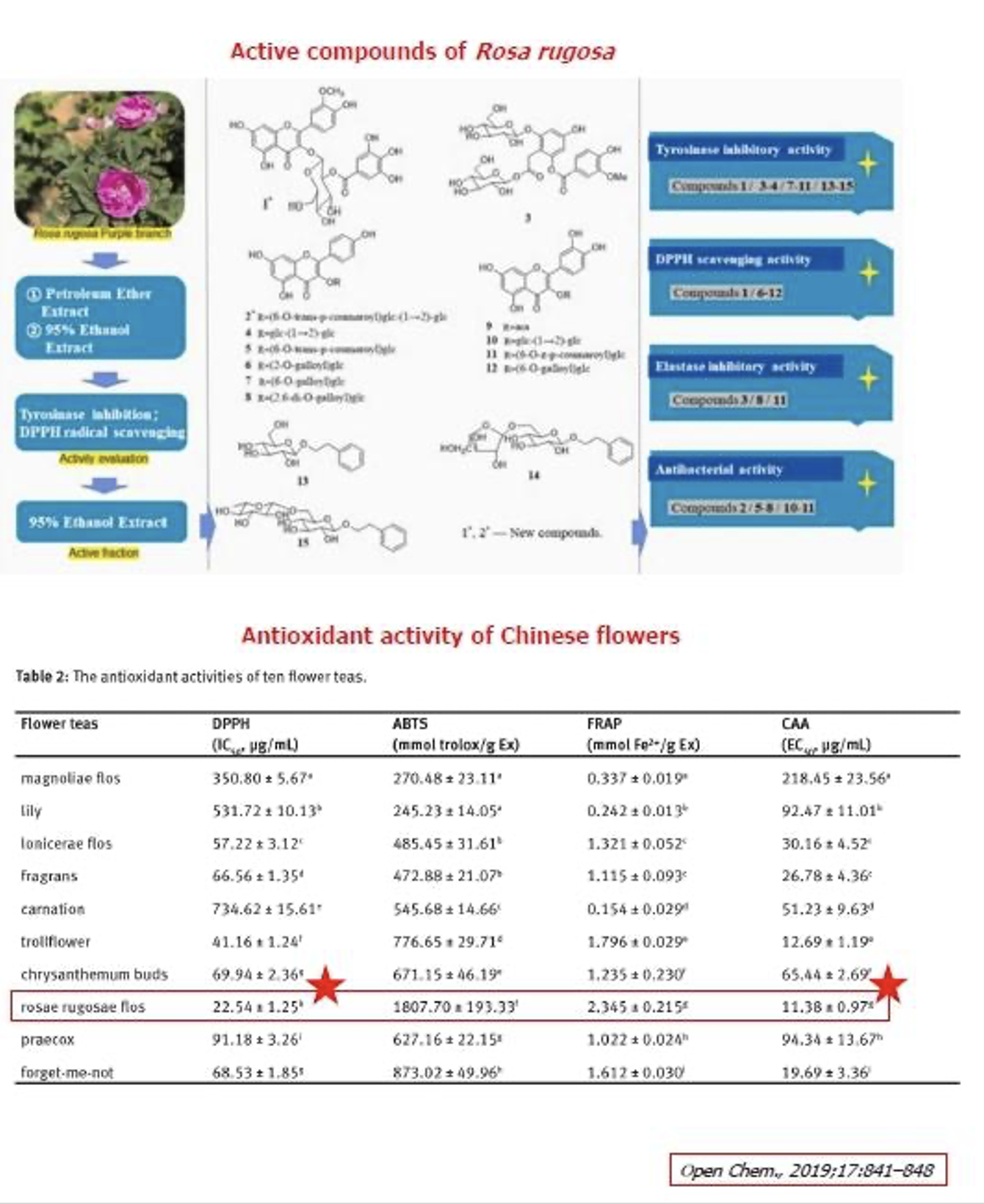 จากการศึกษาวิจัยพบว่า ดอกกุหลาบ (玫瑰花) พืชสมุนไพรพื้นเมืองของเอเชียตะวันออกเฉียงเหนือ มีคุณสมบัติต้านการอักเสบของผิวที่ดีมาก จึงส่งผลให้ดอกกุหลาบกลายเป็นส่วนผสมที่มีคุณค่าสำหรับอุตสาหกรรมเครื่องสำอางในปัจจุบันเป็นอย่างมาก ซึ่งในดอกกุหลาบประกอบไปด้วย ฟีนอล (phenolics) , กรดฟีนอล (phenolic acids) , ฟลาโวนอยด์ (flavonoids) , แทนนิน (tannin) และแคโรทีนอยด์ (carotenoids) ซึ่งมีคุณสมบัติในการต่อต้านอนุมูลอิสระและต้านจุลินทรีย์ และยังช่วยทำให้ผิว เรียบเนียน สะอาด และฟื้นฟูผิว และนอกจากนี้ในงานวิจัยยังพบว่าดอกกุหลาบมีฤทธิ์ต้านรังสี UV , ต้านเอนไซม์ไทโรซิเนส (tyrosinase) ช่วยทำให้ผิวพรรณกระจ่างใส และต้านแบคทีเรียที่ก่อให้เกิดสิว