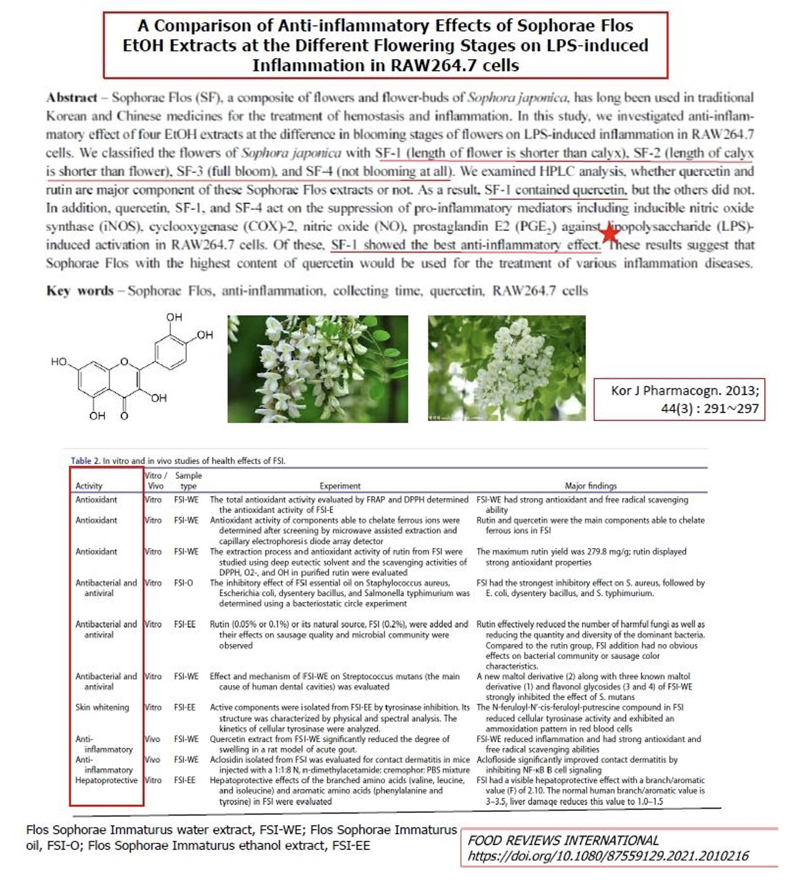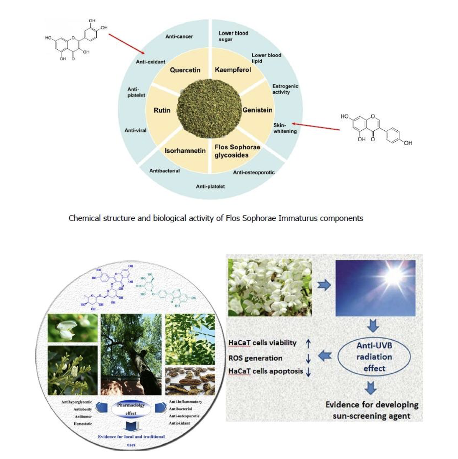 จากงานวิจัยพบว่า ฮว๋ายฮวา (槐花) มีสรรพคุณในการลดการอักเสบได้ดี มีคุณสมบัติยับยั้งเอนไซม์ไทโรซิเนส (tyrosinase) ซึ่งเป็นเอนไซม์ที่ทำให้เกิดการสร้างเม็ดสีเมลานินที่ชั้นผิว นอกจากนี้ยังช่วยให้ผิวกระจ่าง ต่อต้านอนุมูลอิสระ ป้องกันแบคทีเรีย และมีประสิทธิภาพในการป้องกันการดูดซับรังสี UVB และปกป้องผิวจากแสงแดด ในปัจจุบัน ฮว๋ายฮวา (槐花) เป็นที่นิยมใช้ในผลิตภัณฑ์บำรุงผิวและเครื่องสำอาง เนื่องจากมีประสิทธิภาพที่ดี ไม่ระคายเคืองต่อผิว ช่วยปรับสีผิวให้สม่ำเสมอและช่วยในการป้องกันแสงแดดได้