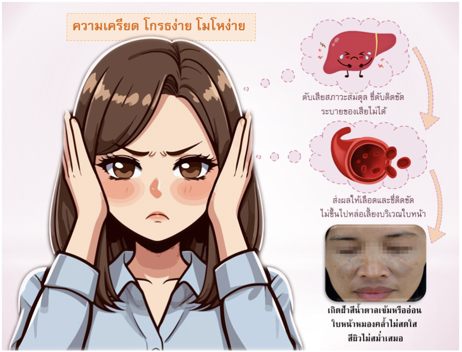 1. ความเครียด และอารมณ์ที่แปรปรวน เช่น โกรธง่าย โมโหง่าย ย่อมส่งผลต่อการทำงานของตับ โดยในศาสตร์การแพทย์แผนจีน ตับมีหน้าที่เก็บเลือด (肝藏血) และมีหน้าที่ควบคุมการกระจายและระบายชี่ (肝主疏泄) ซึ่งเป็นหน้าที่ตรงข้ามและขัดแย้งกัน แต่ก็เป็นการควบคุมซึ่งกันและกัน ดังนั้นเมื่อเกิดภาวะความเครียด ตับจึงเสียสภาวะสมดุล ระบายของเสียได้ไม่ดี ส่งผลให้เลือดและชี่ติดขัด และเกิดความร้อนแผดเผาทำลายเลือดและสารน้ำในร่างกายให้เหือดแห้ง เลือดและสารน้ำจึงไม่สามารถขึ้นไปหล่อเลี้ยงบริเวณใบหน้าได้ ทำให้เกิดฝ้าบริเวณใบหน้า ใบหน้าหมองคล้ำ ใบหน้าไม่สดใส สีผิวไม่สม่ำเสมอ
