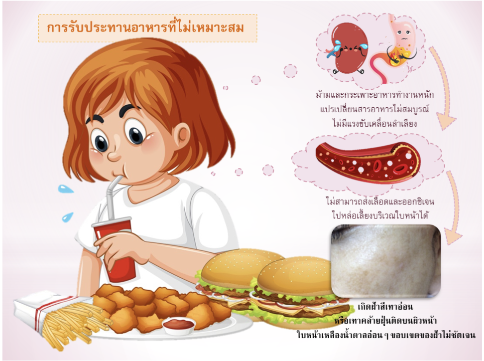 2. การรับประทานอาหารที่ไม่เหมาะสม เช่น การรับประทานของมัน ของทอด อาหารแปรรูป อาหารรสจัด หรืออาหารที่มีน้ำตาลสูงมาก จะส่งผลให้ม้ามและกระเพาะอาหารทำงานหนัก ซึ่งม้ามและกระเพาะอาหารในศาสตร์การแพทย์แผนจีน เป็นอวัยวะส่วนหนึ่งที่ทำหน้าที่ในการย่อยและแปรเปลี่ยนสารอาหาร เพื่อนำไปหล่อเลี้ยงอวัยวะต่าง ๆ ของร่างกาย ดังนั้น ม้ามจึงเปรียบเสมือนมารดาของอวัยวะภายในทั้ง 5 (脾为五脏之母) หลังกำเนิด (后天之本)นอกจากนี้ ม้ามยังมีหน้าที่ควบคุมการขับเคลื่อนลำเลียง (脾主运化) และควบคุมการสร้างเลือด ทำให้เลือดไหลเวียนอยู่ภายในหลอดเลือดได้ (脾生血统血) หากม้ามทำงานผิดปกติย่อมส่งผลทำให้การหมุนเวียนแปรเปลี่ยนสารอาหารไม่สมบูรณ์ จึงมีผลกระทบต่อการขับเคลื่อนลำเลียงสารอาหาร ทำให้ไม่สามารถส่งเลือดและออกซิเจนขึ้นไปหล่อเลี้ยงบริเวณผิวหน้าได้ ทำให้เกิดฝ้า ผิวหน้าไม่เรียบเนียน ผิวหน้าไม่กระจ่างใส