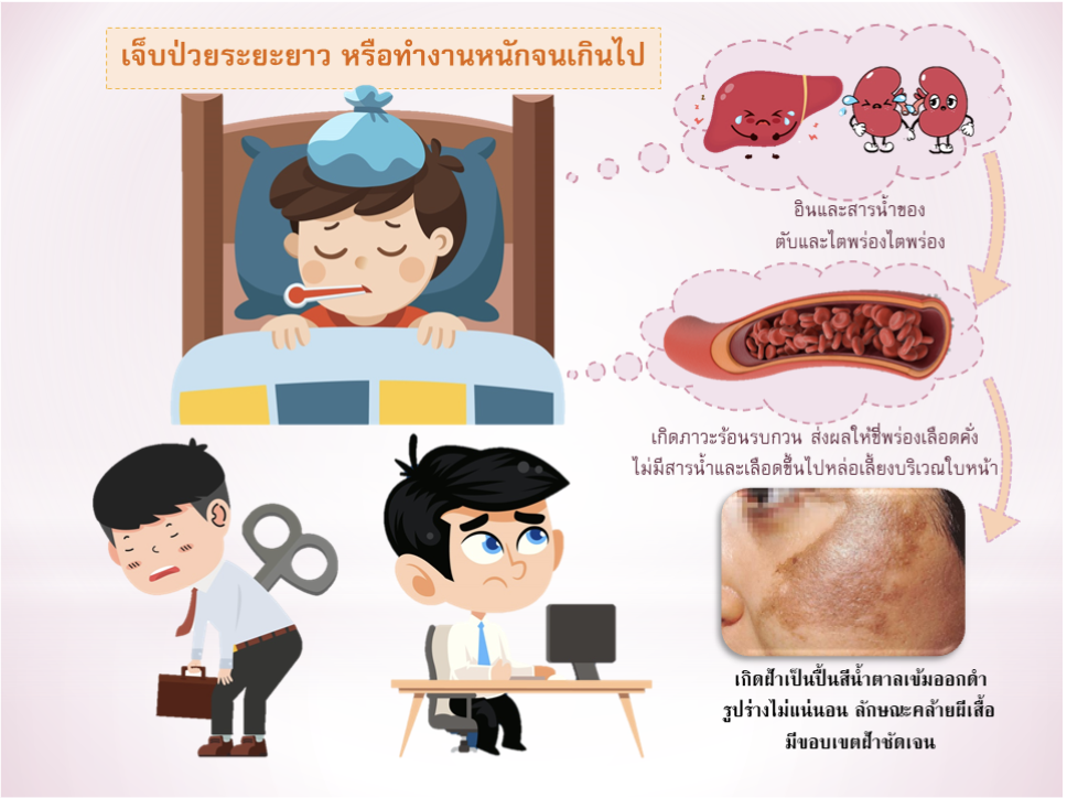3. การทํางานหนักเกินไปหรือการเจ็บป่วยในระยะยาว เมื่อร่างกายอ่อนแอย่อมส่งผลต่อการทำงานของตับและไต ในศาสตร์การแพทย์แผนจีน ไตมีหน้าที่สะสมสารจำเป็นจิง (精) ควบคุมชี่ และปรับสมดุลน้ำ โดยการนำน้ำจากสารอาหารต่าง ๆ ไปเลี้ยงทั่วร่างกาย ดังนั้น หากตับและไตทำงานผิดปกติ ย่อมทำให้อินและสารน้ำของตับและไตพร่อง ส่งผลให้น้ำไม่สามารถขึ้นไปหล่อเลี้ยงบริเวณใบหน้าได้ จึงเกิดภาวะร้อนรบกวนในร่างกาย ทำให้ชี่พร่อง เลือดคั่ง เส้นลมปราณไหลเวียนติดขัด ไม่มีเลือดไปหล่อเลี้ยง ทำให้เกิดฝ้า โดยมีลักษณะเป็นปื้นสีน้ำตาลเข้มออกดำ ผิวหนังแห้งกร้าน ขาดความชุ่มชื้น เกิดริ้วรอยบนใบหน้าได้ง่าย