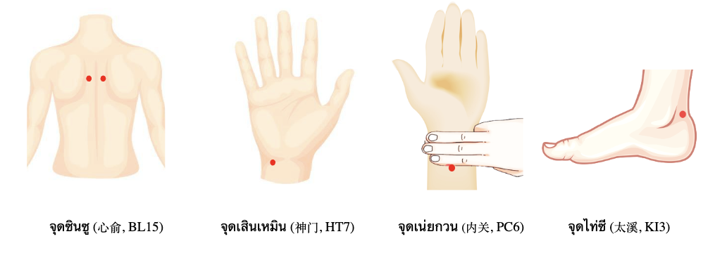 จุดเสินเหมิน (神门, HT7): อยู่บริเวณด้านในข้อมือฝั่งด้านนิ้วก้อย จุดนี้ช่วยลดความวิตกกังวลและความตึงเครียด ทำให้จิตใจสงบ ช่วยนอนหลับ