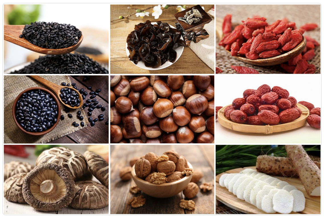 อาหารที่เน้นการบำรุงไต บำรุงชี่และเลือด ได้แก่ งาดำ ถั่วดำ เห็ดหอม เห็ดหูหนูดำ เกาลัด วอลนัท เก๋ากี้ พุทราจีน มันเทศจีน (ฮ่วยซัว) กุยช่าย เป็นต้น
