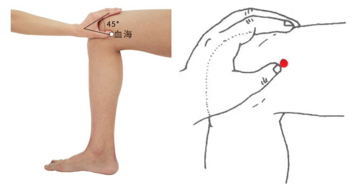 จุดเซวี่ยไห่ จุดนี้อยู่บริเวณขอบด้านในของกระดูกสะบ้าขึ้นมา 2 ชุ่น